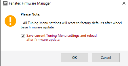 체크 박스에 체크하여 펌웨어 업데이트를 진행하면 세팅이 초기화 되지 않아 기존 세팅을 그대로 사용할 수 있습니다. (체크 박스 해제 시 세팅이 초기화 됩니다.)